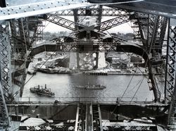 Creator: Cash, Edward Francis Nicholson (1887-1964) Contributing Institution: Moore Theological College Description: Interior view of the bridge construction, looking down over the harbour to the water below. A ferry is crossing underneath. Image digitised from glass lantern slide View Full Item at Moore Theological College -