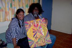 Creator: Dylys, Bible Society Australia, and Chris Contributing Institution: Moore Theological College Description: Indigenous man and woman, Chris and Dylys with Chris' artwork. CD label reads : "NTOM Flying Bibleman" View Full Item at Moore Theological College -