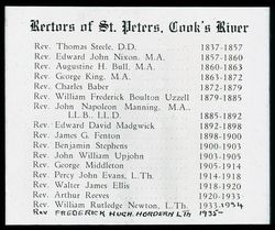 Creator: Gledhill, Percy Walter (1890-1962) Contributing Institution: Moore Theological College Description: List of Rectors of St Peter's Cook's River, from Rev. Thomas Steele (1837-1857) to Rev Frederick Hugh Hordern (1935-). Digitised from a glass lantern slide. View Full Item at Moore Theological College -