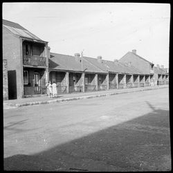 Creator: Judd, Bernard George (1918-1999) Contributing Institution: Moore Theological College Description: Row of terrace houses with two women standing on footpath. Black and white photograph on glass lantern slide. View Full Item at Moore Theological College -