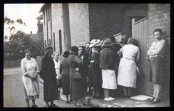 Creator: Robinson, Richard Bradley (1888-1966) Contributing Institution: Moore Theological College Description: Crowd of people outside wooden gate. Caption: "Waiting for jumble sale, Deaconess House". Digitised from a glass lantern slide. View Full Item at Moore Theological College -