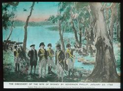 Creator: Robinson, Richard Bradley (1888-1966) Contributing Institution: Moore Theological College Description: Photograph of printed illustration of Governor Arthur Phillip and other naval officers at Sydney Cove. Caption: "The discovery of the site of Sydney by Governor Phillip, January 23, 1788". Hand-coloured. Digitised from a glass lantern slide. View Full Item at Moore Theological College -