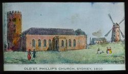 Creator: Robinson, Richard Bradley (1888-1966) Contributing Institution: Moore Theological College Description: Photograph of printed picture of church and windmill. Caption: "Old St Philip's Church, Sydney, 1810". Hand-coloured. Digitised from a glass lantern slide. View Full Item at Moore Theological College -