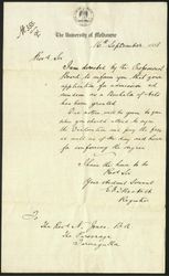 Creator: Jones, Nathaniel (1861-1911) and a'Beckett, E.J. Date: 1891-09-16 Contributing Institution: Moore Theological College Description: Letter advising Jones that his application for admission 'ad eundem' to the degree of Bachelor of Arts, University of Melbourne, had been accepted. View Full Item at Moore Theological College -