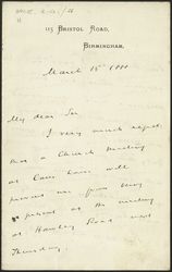 Creator: Dale, Robert William (1829-1895) Date: 1888 Contributing Institution: Moore Theological College Description: Page 1 of a letter from R.W. Dale to J.W. Graham. Paper has letterhead '115 Bristol Road, Birmingham'. View Full Item at Moore Theological College