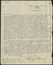 Creator: Jones, Nathaniel (1861-1911) and Griffith Thomas, William Henry (1861-1924) Date: 1905-04-06 Contributing Institution: Moore Theological College Description: Reply to a letter from Jones dated 24-1-1905. Discussion of a book by Jones on the Articles. Deals with matters of formatting, the book's relation to Kidd's work in the Oxford series. Discusses his appointment to Wycliffe Hall, Oxford, and requests that Jones send him an outline of the course bei... View Full Item at Moore Theological College