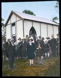 Creator: Gledhill, Percy Walter (1890-1962) Date: 1926 Contributing Institution: Moore Theological College Description: Oxford Falls Church opening - exterior with congregation. Hand-coloured. Digitised from a glass lantern slide. View Full Item at Moore Theological College -