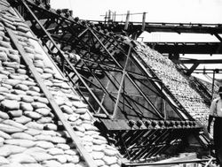 Creator: Cash, Edward Francis Nicholson (1887-1964) Date: 1930 Contributing Institution: Moore Theological College Description: Sandbags used in the construction of the bridge, stored in piles beside pipes. Photo Album - 004 Image digitised from glass lantern slide View Full Item at Moore Theological College -