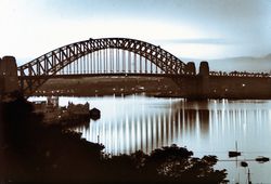 Creator: Cash, Edward Francis Nicholson (1887-1964) Date: 1935 Contributing Institution: Moore Theological College Description: Sydney Harbour Bridge reflected in the water of the Sydney harbour. Left side. Photo taken from Lavendar Bay. Image digitised from a black and white lantern slide Sydney Harbour Bridge - 038 View Full Item at Moore Theological College -