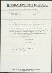 Creator: Murray, Iain Hamish (1931-) Date: 1986-05-08 Contributing Institution: Moore Theological College Description: Letter from Iain H. Murray, Banner of Truth Trust Publishers, to Simon Manchester, mentioning mutual friends and an upcoming conference. View Full Item at Moore Theological College