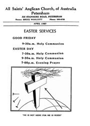 Creator: All Saints' Church (Petersham, N.S.W.) Date: 1987-04-01 Contributing Institution: Moore Theological College Description: The parish magazine of All Saints' Church, Petersham. View Full Item at Moore Theological College -