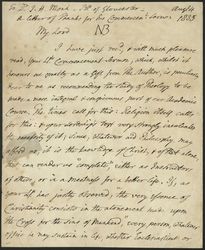 Creator: Simeon, Charles (1759-1836) Date: 1835 Contributing Institution: Moore Theological College Description: Page 1 of letter from Charles Simeon to the Bishop of Gloucester J.H. Monk, August 1835, on the value of teaching the atonement. View Full Item at Moore Theological College