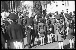 Creator: Judd, Bernard George (1918-1999) Contributing Institution: Moore Theological College Description: Governor General William McKell speaking to Girls' Brigade girls, outside St Peter's archway. Black and white photograph on glass lantern slide. View Full Item at Moore Theological College