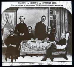 Creator: Gledhill, Percy Walter (1890-1962) Contributing Institution: Moore Theological College Description: Photograph of painting of six bishops seated or standing around a table. Caption: "Meeting of the Bishops in October 1850 for the purpose of establishing the Australian Board of Missions, Bishop Short, Adelaide; Bishop Selwyn, New Zealand; Bishop Nixon, Tasmania; Bishop Tyrell, Newcastle; Bishop ... View Full Item at Moore Theological College