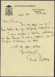 Creator: Barton Babbage, Stuart (1916-2012) Date: 1998-04-01 Contributing Institution: Moore Theological College Description: Letter from Stuart Barton Babbage, with his personal letterhead, to Simon Manchester, offering Simon the letters from Sir William Dobbie and the 5th Marquis of Salisbury. View Full Item at Moore Theological College -