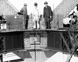 Creator: Cash, Edward Francis Nicholson (1887-1964) Contributing Institution: Moore Theological College Description: Three men standing at the centre of the Sydney Harbour Bridge. They are standing between the side of the bridge and a rope fence. Image digitised from glass lantern slide View Full Item at Moore Theological College -
