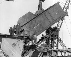 Creator: Cash, Edward Francis Nicholson (1887-1964) Contributing Institution: Moore Theological College Description: A group of workmen on the top of the arch, connecting the two sides, with the final piece being loaded by crane. Image digitised from glass lantern slide View Full Item at Moore Theological College -