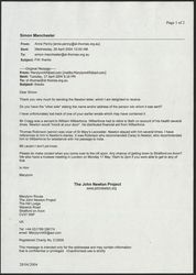 Creator: Rouse, Marylynn Date: 2004-04-29 Contributing Institution: Moore Theological College Description: Email from Marylynn Rouse of the John Newton project, to Simon Manchester, confirming the recipient of the letter from John Newton is William Wilberforce. View Full Item at Moore Theological College -