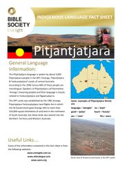 Creator: Bible Society Australia Date: 2011-08-25 Contributing Institution: Moore Theological College Description: Fact sheet providing an overview of the Pitjantjatjara language. Content includes examples of Pitjantjatjara words, the history of the Pitjantjatjara people, and a list of print, audio and video resources. View Full Item at Moore Theological College -