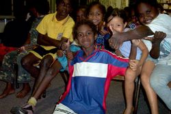 Creator: Bible Society Australia and Rob Contributing Institution: Moore Theological College Description: Rob sitting on a beach with six Indigenous ladies. CD label reads : "NTOM Flying Bibleman" View Full Item at Moore Theological College -