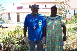 Creator: Dylys, Bible Society Australia, and Chris Contributing Institution: Moore Theological College Description: Indigenous man and woman, Chris and Dylys with Chris' artwork. CD label reads : "NTOM Flying Bibleman" View Full Item at Moore Theological College -