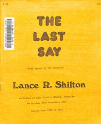 Shilton, Lancelot Rupert (1921-1998).The Last Say / by Lance R. Shilton. Adelaide : Trinity Publishing Society.. 1973. Retrieved from the Atla Digital Library, https://archives.moore.edu.au/documents/detail/133218.