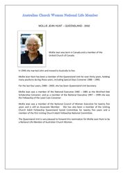 Church Women, Australian.Acw Life Member Mollie Hunt. Australian Church Women. 2003. Retrieved from the Atla Digital Library, https://archives.moore.edu.au/documents/detail/140570.