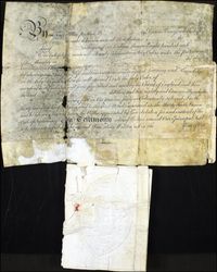 Written by an official scribe for the purpose of admitting a person into Holy Orders by a Bishop. The spaces for names have been left blank. Attached is a seal of Bishop John Fisher