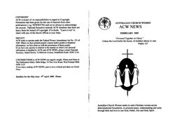 Church Women, Australian.Acw News 2005 2 February. Australian Church Women. 2005. Retrieved from the Atla Digital Library, https://images.quartexcollections.com/moore/thumbnails/preview/beec5c95-5a10-4438-9a7a-d77d90b0316d.