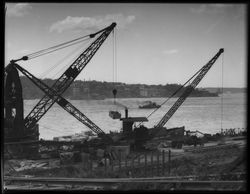 Cash, E. (1920). Beginning of bridge construction - cranes, with ferry on harbour. Retrieved from the Atla Digital Library, https://archives.moore.edu.au/documents/detail/136660.