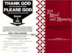 Jarrett, Geoffrey.For Mind and Memory : Prayers, Teachings of Christ and Summaries of the Faith Arranged for Learning by Heart/ Compiled by The Reverend Geoffrey Jarret, P.p. Melbourne : Australian Catholic Truth Society Publications.. 1978. Retrieved from the Atla Digital Library, https://archives.moore.edu.au/documents/detail/129199.