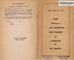 Rules Relating to the Acceptance and Training of Candidates for the Ministry / Baptist Union of N.s.w. Sydney : Church Missionary Society of Australia.. 1969. Retrieved from the Atla Digital Library, https://archives.moore.edu.au/documents/detail/206501.