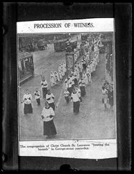 Christ Church St Laurence Procession of Witness: 'The congregation of Christ Church St Laurence, 'beating the bounds' in George St yesterday'. Photograph of image and caption in a publication. Digitised from a quarter-plate glass negative.