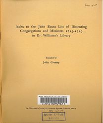Creasey, J. (1964). Index to the John Evans list of dissenting congregations and ministers 1715-1729: in Dr. Williams's library / compiled by John Creasey. Retrieved from the Atla Digital Library, https://archives.moore.edu.au/documents/detail/126385.