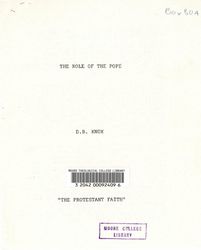Knox, D. B. (David Broughton) (1916-1994). The Role of the Pope. . 1972. Retrieved from the Atla Digital Library, https://archives.moore.edu.au/documents/detail/9259.