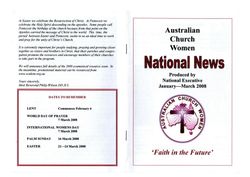 Church Women, Australian.Acw News 2008 1 January. Australian Church Women. 2008. Retrieved from the Atla Digital Library, https://archives.moore.edu.au/documents/detail/148325.