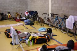 Sleeping arrangements inside a gymnasium. CD label reads : "Canada Bike for Bibles 2006 / Photos by Alan Best" Series Title : Canada Bike for Bibles 2006 / Photos by Alan Best
