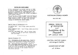 Church Women - NSW unit, Australian. Annual Service 1994. Australian Church Women. 1994. Retrieved from the Atla Digital Library, https://archives.moore.edu.au/documents/detail/144220.