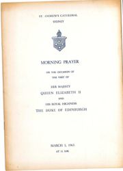 St Andrew's Cathedral (Sydney, N. (1963). Morning prayer on the occasion of the visit of Her Majesty Queen Elizabeth II and His Royal Highness the Duke of Edinburgh, March 3rd 1963. Retrieved from the Atla Digital Library, https://archives.moore.edu.au/documents/detail/266756.