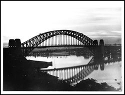 The Sydney Harbour Bridge reflecting in the harbour in the early hours of New Years Day, 1935. Copy from a slide made from Ilford soft grade pan, 28th Jan 1937. Quarter plate negative no. 28 Image digitised from a glass plate negative