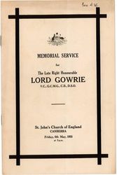 St John's Church (Canberra, A.C.T.). Memorial Service for the Late Right Honourable Lord Gowrie. St John's Church (Canberra, A.C.T.). 1955. Retrieved from the Atla Digital Library, https://archives.moore.edu.au/documents/detail/266750.