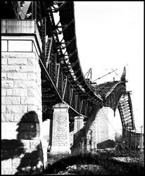 Cash, E.Sydney Harbour Bridge - view of almost completed arch, looking upwards from base of pillar. Retrieved from the Atla Digital Library, https://archives.moore.edu.au/documents/detail/134731.
