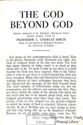 Birch, L. Charles.The God Beyond God : Address Delivered In St Stephen's Macquarie Street, Sydney, Sunday, 7-2-65, / by Professor L. Charles Birch. Sydney : St Stephen's Church.. 1965. Retrieved from the Atla Digital Library, https://archives.moore.edu.au/documents/detail/123669.