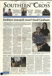 Embiyo research won’t heal Graham by Amy Butler - on the ability and role of embryo research Aspinall seeks Royal Commission on sex abuse Days and nights of ‘sheer terror’ - on the Arab-Israeli conflict As we are murdered the world looks away by Jeremy Halcrow - on the conflict in Sudan MTS work in west Sydney - on MTS staffers including Kamal Weerackoon. The West needs you! - on population growth in the west, especially amongst the Chinese. We gave our embryos a chance to live by Amy Butler - on IVF Christians are to blame for media blackout of God Volume 08 number 04 2002-05-01/2002-05-30