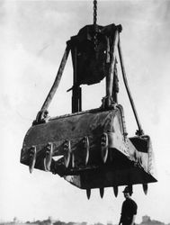 Workman standing underneath an open crane claw. The claw is the main item in the image Photo Album - 018 Black and white positive, digitised from glass lantern slide