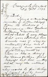States that he has found a number of letters written to [Broughton] from the Bishops of Tasmania, New Zealand, Melbourne and Newcastle. He has also found a diary of Broughton's journey to Australia in 1829 and some private letters written to Broughton by his wife and others which he will forward to him.