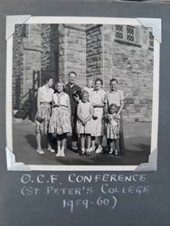 Photo from Judith Bond of her family at OCF Conference 1959-1960. She labels it as "Steward Family at the 1st Convention 1959-1960" and the names are Ruth, Judith, Dr Harrold, Miriam, Priscilla, Mrs Gwenda, Elisabeth, John