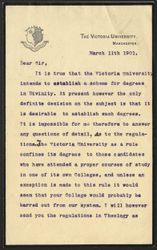 Response to inquiries by Jones regarding the Victoria University's proposed scheme for degrees in Divinity. 3 published items attached: Pamphlet from the University of London noting statutes and regulations for the reconstitution of the University, for studies and examinations; Regulations relating to scriptural examinations at the University of London; Information about the degrees of BA and MA from the Student's Delegacy, Oxford.