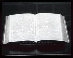 Bible opened to Psalm 116. Caption: "Australia's 1st Bible, opened on text (Ps. 116:12)". This text was used by Chaplain Richard Johnson for the first church service held in Australia in 1788. Digitised from a glass lantern slide.