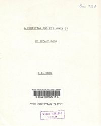 Knox, D. (1979). A Christian and his money IV: he became poor. Retrieved from the Atla Digital Library, https://archives.moore.edu.au/documents/detail/9066.